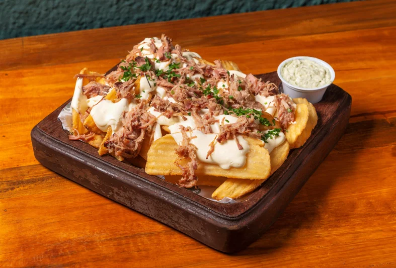 Batata Campeira- 650g de batata rustica, temperada com ervas, finalizada com pulled pork. Acompanha maionese da casa. Restaurante Porto Burguer - Porto Alegre/RS (Foto: Divulgação)