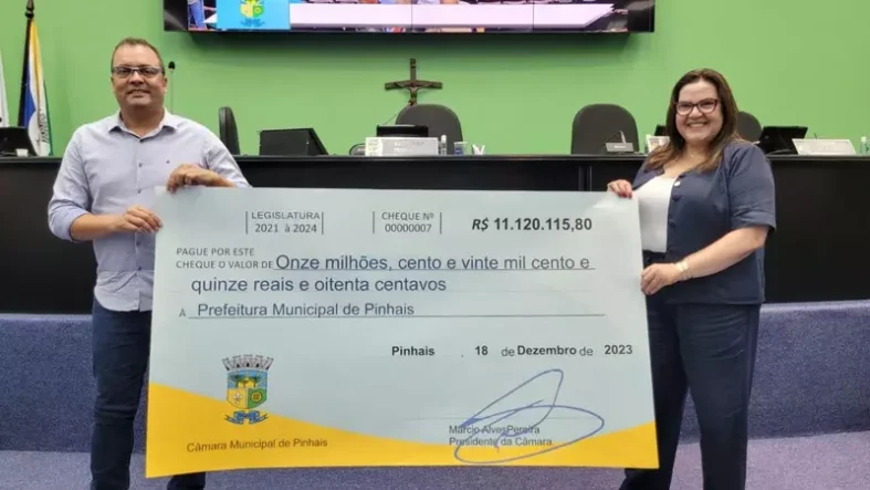 Na última sessão do ano, realizada nesta terça-feira (19), o poder legislativo municipal realizou a entrega para a Prefeitura de Pinhais de R$ 11.120.115,80 – recursos provenientes da economia que a Câmara Municipal de Vereadores de Pinhais realizou durante o ano de 2023. O montante economizado teve aumento de quase 30% em relação ao ano anterior, quando foi entregue ao executivo R$ 7.892.104,44.