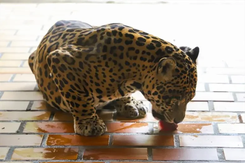 A outra puma, Juma, com 10 anos de idade, também receptiva ao sorvete, é uma sobrevivente de atropelamento de colheitadeira. A puma também acolheu o sabor e se refrescou com a iguaria.
