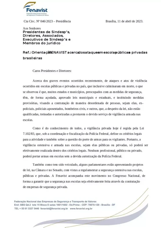 “Nossa atividade exige capacitação e treinamento que somente as empresas idôneas, filiadas aos sindicatos congregados pela Federação Nacional das Empresas de Segurança e Transporte de Valores (Fenavist) têm condição de oferecer. Alerto aos gestores públicos e também aos da iniciativa privada que queiram reforçar a segurança dos estabelecimentos educacionais para que contratem serviços de empresas que atuam com autorização da Polícia Federal”, destaca Alfredo Ibiapina, presidente do Sindicato das Empresas de Segurança Privada do Paraná (SINDESP-PR).