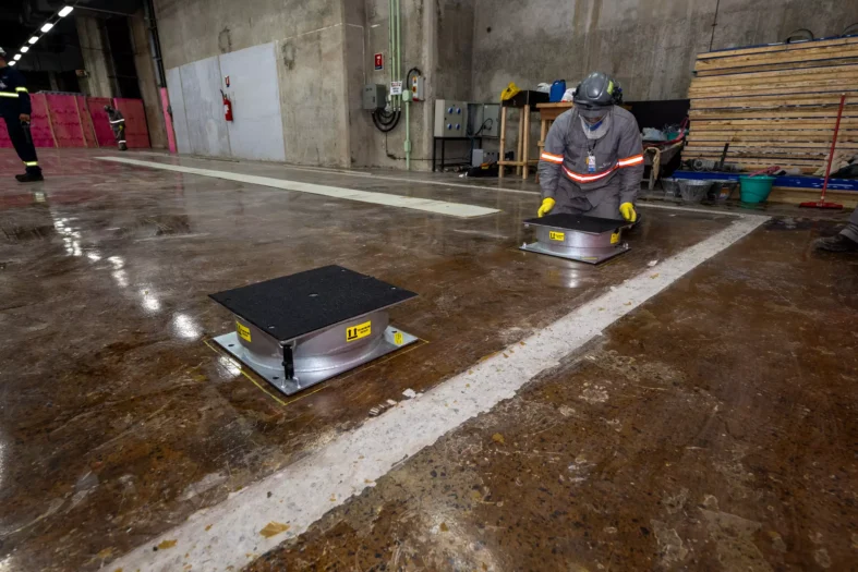 Os isoamortecedores são como “amortecedores especiais” para equipamentos suspensos. No caso da Sala Segura, toda a estrutura de 140 m² será construída sobre eles. De acordo com o fiscal de campo Everson Alves Pereira, o piso sobre o qual esses equipamentos serão instalados precisa ser milimetricamente nivelado para recebê-los.