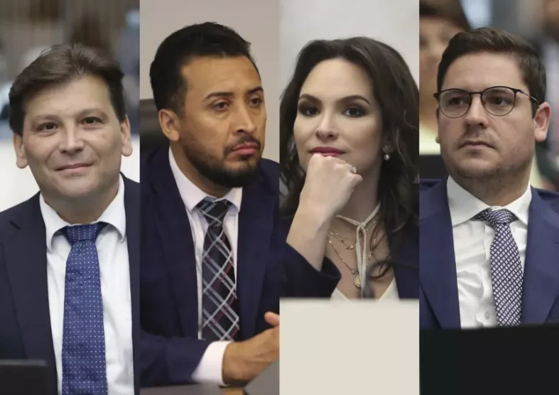 Bancada do Progressistas na Casa: (esq. p/ dir.) deputado Paulo Gomes, deputado Soldado Adriano José, líder do partido na Assembleia, a deputada Maria Victoria, presidente da legenda no estado, e o deputado Matheus Vermelho.Créditos:Fotos: Orlando Kissner/Alep