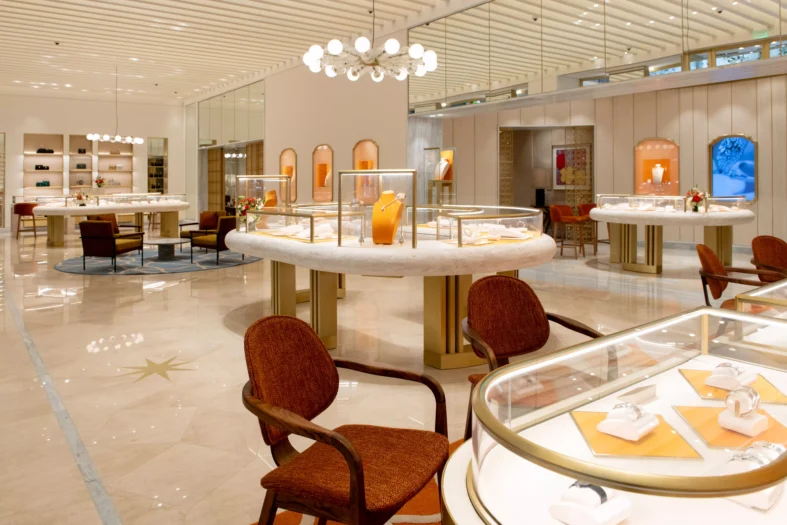 Um diferencial da boutique é a galeria semicircular caracterizada por um balcão curvo e vitrines Condotti. A porta deslizante que dá acesso a um dos dois lounges privados apresenta um padrão geométrico inspirado no Panteão Romano, com uma combinação de círculos e quadrados, além da icônica estrela de oito pontas da Bulgari. Os espaços privados oferecem aos clientes um ambiente convidativo para relaxar e desfrutar da melhor experiência da hospitalidade italiana.