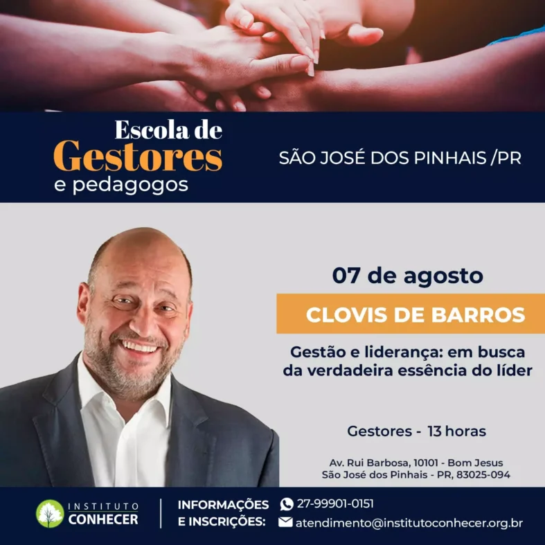 A Escola de Gestores e Pedagogos do Instituto Conhecer tem programação em São José dos Pinhais (PR) durante todo o ano e a participação é aberta a professores e pedagogos tanto da rede pública quanto da rede privada. Interessados podem se inscrever através do whatsapp (27) 99901-0145.