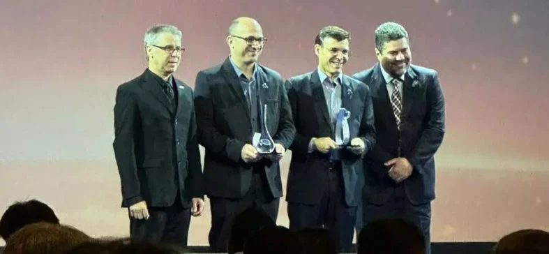 Sugestão de legenda da foto Prêmio ANEFAC (3): Felipe Gutterres, diretor de Finanças e Relações com Investidores (DFI) e Robson Carlos Nogueira, superintendente contábil, recebem o prêmio em São Paulo