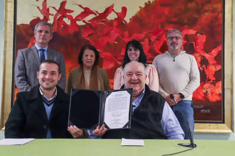O prefeito Rafael Greca e o presidente Tiago Waterkemper na Prefeitura de Curitiba, o termo de ciência do contrato a ser celebrado com a empresa curitibana Electromotive Energia Renovável, que venceu a concorrência aberta para a instalação de uma miniusina de energia solar no Centro de Saúde, a sede do instituto, no bairro Rebouças, em Curitiba.