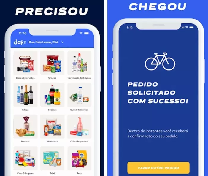A Daki é um app que está mudando radicalmente a forma que as pessoas fazem compras de mercado. O motivo é simples: todos os pedidos feitos no aplicativo são entregues em minutos! Tem de tudo: mercearia, hortifruti, carnes & congelados, padaria, bebidas, casa & limpeza, cuidado pessoal, bebê e até produtos para os pets (animais de estimação). E o melhor, a Daki tem estoque próprio, ou seja, nada de pedir um produto esgotado ou ter que ficar ligando para o entregador. Tudo é feito na própria Daki e de forma muito rápida.