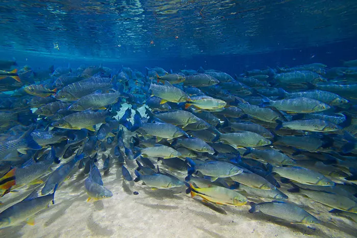Graças a essa visibilidade, o visitante pode observar, durante o passeio, toda a riqueza da fauna e flora subaquática local, incluindo peixes coloridos, a nascente do rio e fervedouros d’água.