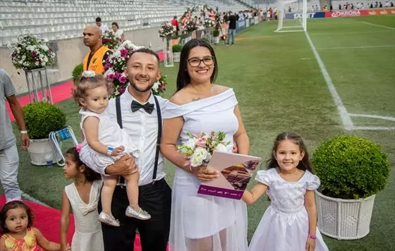 A cerimônia foi realizada na Arena da Baixada e reuniu aproximadamente 18 mil pessoas, a maioria familiares dos noivos.