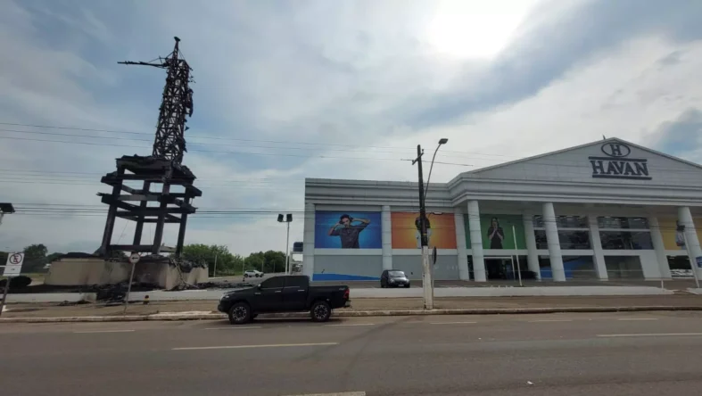 Duas pessoas em uma motocicleta Honda Biz foram flagradas ateando fogo na Estátua da Liberdade da Havan, localizada na Jorge Teixeira, em Porto Velho.