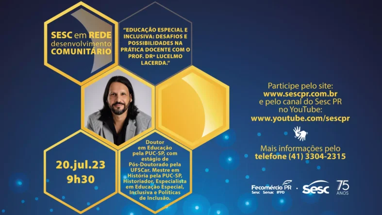 O Sesc PR tem estimulado espaços de diálogo sobre educação, saúde e assistência com o projeto Sesc em Rede. Com o tema: “Educação Especial e Inclusiva: desafios e possibilidades na prática docente”, o evento será transmitido ao vivo pelo canal do Sesc PR no Youtube, a partir das 9h30, no dia 20 de julho, com tradução em libras.