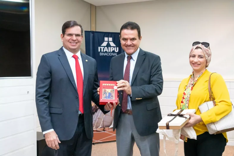 O embaixador assistiu ao vídeo institucional de Itaipu, no Centro de Recepção de Visitantes, e depois, na sala VIP, trocou presentes com o diretor financeiro de Itaipu.