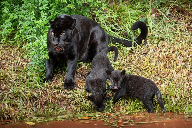 As duas oncinhas são gêmeas melânicas (pretas) e se parecem muito com a mãe, Nena. Elas nasceram em 29 de novembro do ano passado, concidentemente no Dia Internacional da Onça-Pintada, e crescem saudáveis, pesando aproximadamente 9kg. Quando adultas, elas poderão chegar a pesar em torno de 70kg.
