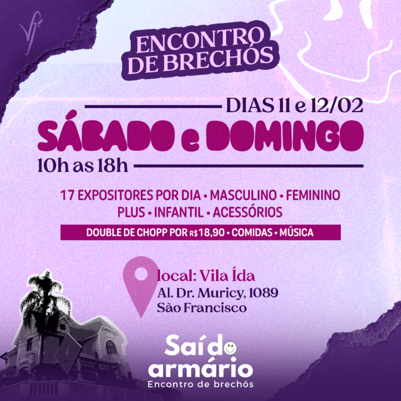 Já o “Encontro de Brechós Saí do Armário” está em sua 16ª edição e mantém seus 22 expositores com diferentes stands em cada dia oferecendo ao público roupas femininas, masculinas e infantil, para todos os tamanhos. “Além disso, esta edição do encontro contará com outros expositores como o espaço relax com terapia e massagem, acessórios, produtos geek, papelaria e sex shop, e os brechós com peças a partir de 10 reais”. esclarece a empreendedora e produtora de eventos, Kerolen Martins.