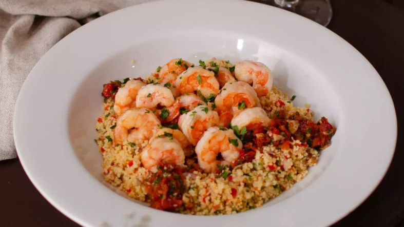 Camarões à provençal é uma das três opções de prato principal para os clientes escolherem. Gabriel Spinardi.