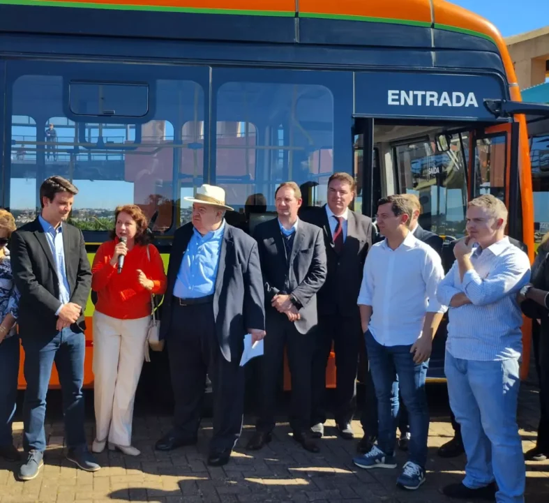 “Este ônibus atrás de nós tem as cores da blusa da Marilza, eu quem escolheu”, brincou o prefeito Rafael Greca ao chamar a ex-secretária para lugar de destaque na solenidade de entrega dos ônibus elétricos no Parque Tanguá