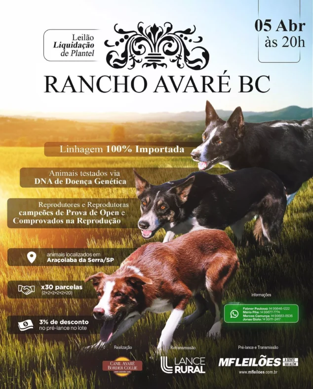 O Leilão Liquidação Rancho Avaré BC compõe uma grande vitrine de um mercado relativamente novo, mas em franca expansão. Os preços impressionam, com cães sendo comercializados por até R$ 50.000,00 e coberturas que chegam a valer R$ 4.000,00. “Os preços dependerão da linhagem e do histórico nas competições de pastoreio. Quem investir neste leilão começará pela parte de cima da prateleira”, garante Figueiredo.