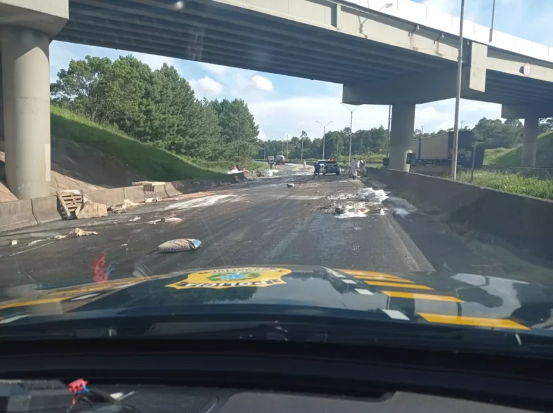 Na madrugada de segunda, por volta de 01:45h, tambores de produtos perigosos se soltaram de um caminhão e se espalharam pela pista, no km 71 da BR 116, município de Quatro Barras, interditando a pista no sentido São Paulo.