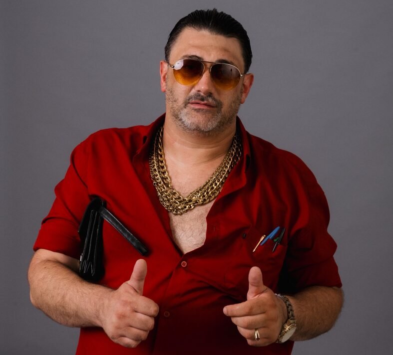 A indumentária é espalhafatosa e vai te lembrar de algum tio fazendo pose de galã numa fotos dos anos 1970: camisa aberta no peito, corrente de ouro, óculos escuros estilo aviador, sapato de bico fino e uma cabeleira penteada com muito mais gel do que o bom-senso consideraria aceitável.