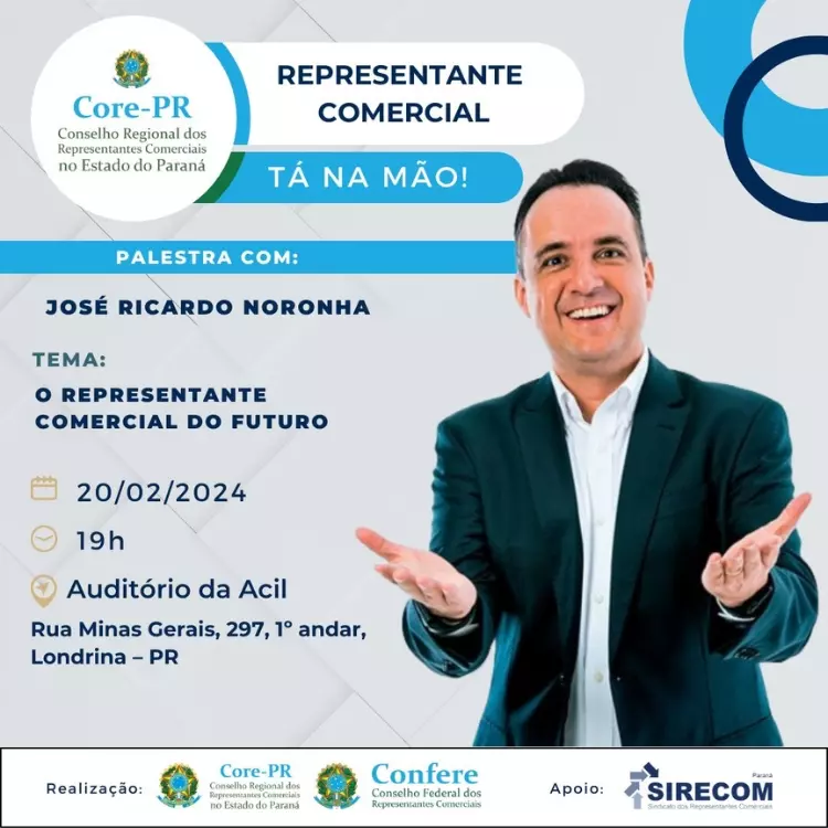 Dada essa importância, a profissão tem ganhado cada vez mais destaque, oferecendo uma carreira viável e promissora para aqueles que se dedicam e buscam atualização constante. O perfil do “Representante Comercial do Futuro” é tema de uma série de palestras promovidas pelo Sistema Confere/Cores. O Core-PR (Conselho Regional dos Representantes Comerciais no Estado do Paraná) organizará uma dessas palestras no próximo dia 20 de fevereiro, na cidade de Londrina, no auditório da ACIL.