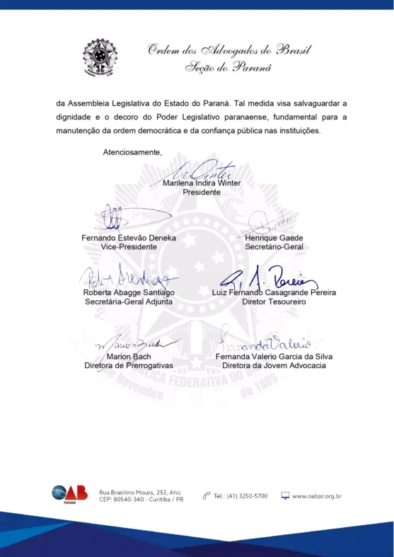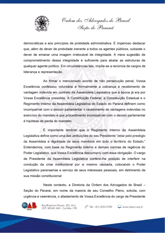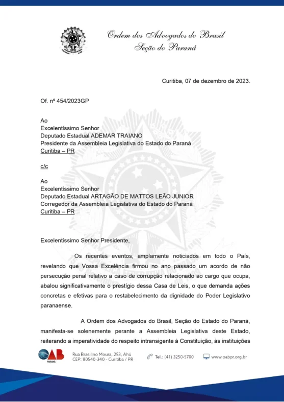 A seção paranaense da Ordem dos Advogados do Brasil (OAB/PR) pediu na data de ontem (7/12), que o deputado Ademar Traiano se afaste da presidência da Assembleia Legislativa.