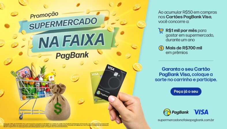 São Paulo, 06 de setembro de 2023 – O PagBank, banco digital completo em serviços financeiros e meios de pagamentos, em parceria com a Visa, líder mundial em pagamentos digitais, anuncia a nova campanha ‘Supermercado na Faixa’. Clientes do PagBank que fizerem o cadastro e realizarem compras com o Cartão PagBank Visa concorrem a sorteios semanais e mensais. A promoção ficará disponível até o final do ano e contemplará mais de mil pessoas com prêmios de até R$ 12.000.