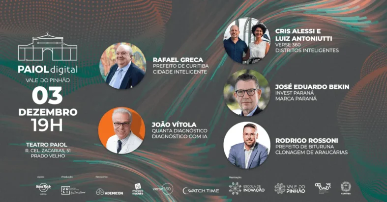 A programação do Paiol Digital de dezembro terá, também, a apresentação do Dr. João Vítola, diretor-geral da Quanta Diagnósticos por Imagem. O médico curitibano, reconhecido internacionalmente pela trajetória na cardiologia e medicina nuclear, irá falar sobre o tema “Diagnóstico com IA”. José Eduardo Bekin, CEO da Invest Paraná, irá palestrar sobre o livro “O Estado como Marca – Potencialidades, Perspectivas e Possibilidades”, no qual explora os desafios e as oportunidades na construção e consolidação da marca Paraná. A roda de conversa terá, ainda, a apresentação do prefeito de Bituruna Rodrigo Rossoni, que irá falar sobre “Aceleração de Araucárias”.