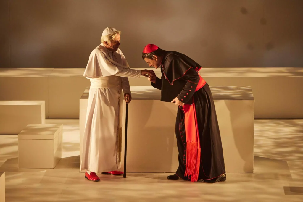 Com direção de Munir Kanaan, a peça leva aos palcos o encontro imaginado entre dois líderes da Igreja Católica com visões de mundo opostas: o conservador Papa Bento XVI, interpretado por Zécarlos Machado, e o progressista cardeal argentino Jorge Bergoglio, então futuro Papa Francisco, vivido por Celso Frateschi.