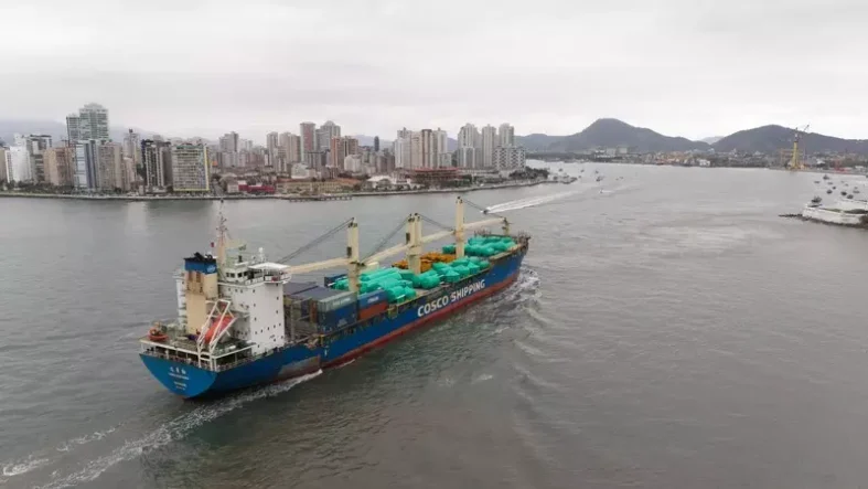 São Paulo, 01 de julho de 2024 – O primeiro trem da Linha 17-Ouro chegou ao Brasil na manhã deste sábado (29), vindo da China onde foi fabricado. A composição desembarcou no Porto de Santos e agora passará pelos procedimentos de liberação aduaneira antes de ser transportada até o Pátio Água Espraiada, na capital paulista.