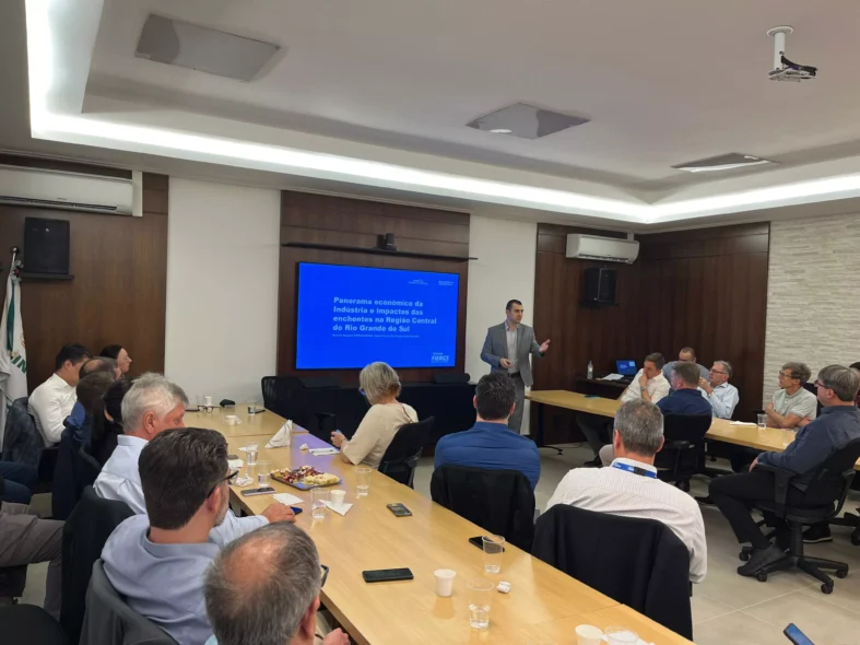 O encontro seguiu com a palestra do economista-chefe da FIERGS, Giovani Baggio. Ele fez uma análise da conjuntura atual e traçou perspectivas para 2025. Segundo o economista, a enchente causou problemas maiores para a área industrial, em especial a indústria de transformação. “A produção industrial gaúcha despencou 26% em maio em comparação com abril, segundo o IBGE, maior queda já apurada pela pesquisa desde 2002. Já no campo, boa parte da safra de verão já tinha sido colhida e a safra de inverno ainda não estava plantada. Com isso, temos uma projeção positiva para o agro”, explicou. “A primeira projeção da CONAB é positiva para safra de grãos 2024/2025 e pode ser recorde, superando as 38 milhões de toneladas”, complementou.