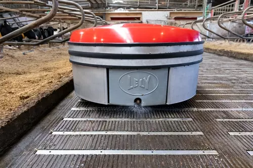 exemplo, com um raspador de estrume. “Menos obstáculos aumentam o conforto e segurança dos animais. Além disso, o produtor não tem a preocupação de realizar grandes instalações, somente dedicar um espaço para a estação de carregamento do robô”, comenta.