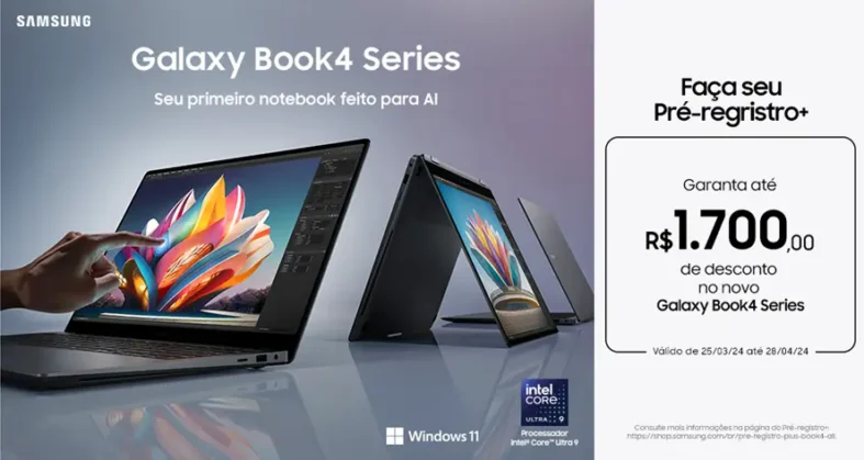 São Paulo, 26 de março de 2024 – A Samsung Brasil anuncia uma ação de Pré-registro+ para os usuários interessados em adquirir os novos notebooks Galaxy Book4 Series com descontos de até R$ 1.7001, e tablets da linha Galaxy Tab S6 Lite com desconto de até R$ 2002.