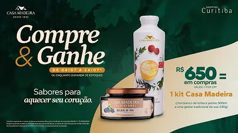 Com R$ 650 em compras, o cliente ganha um kit com uma Geleia Tradicional de Uva e um Chá Branco de Lichia e Jasmim da Casa Madeira.