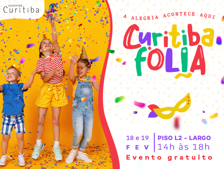 Os pequenos foliões já podem anotar na agenda, pois o Shopping Curitiba acaba de anunciar o Curitiba Folia. A programação será nos dias 18/2 (sábado) e 19/2 (domingo), totalmente gratuita, das 14h às 18h, no piso L2 (Largo Curitiba).