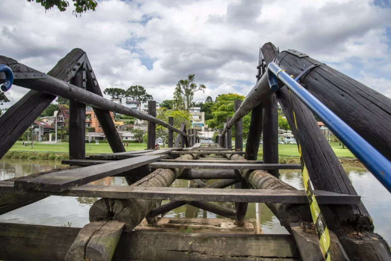A ponte de madeira para pedestres do Parque Barigui, que faz a ligação da ciclovia da Rua Doutor Aluízio França…