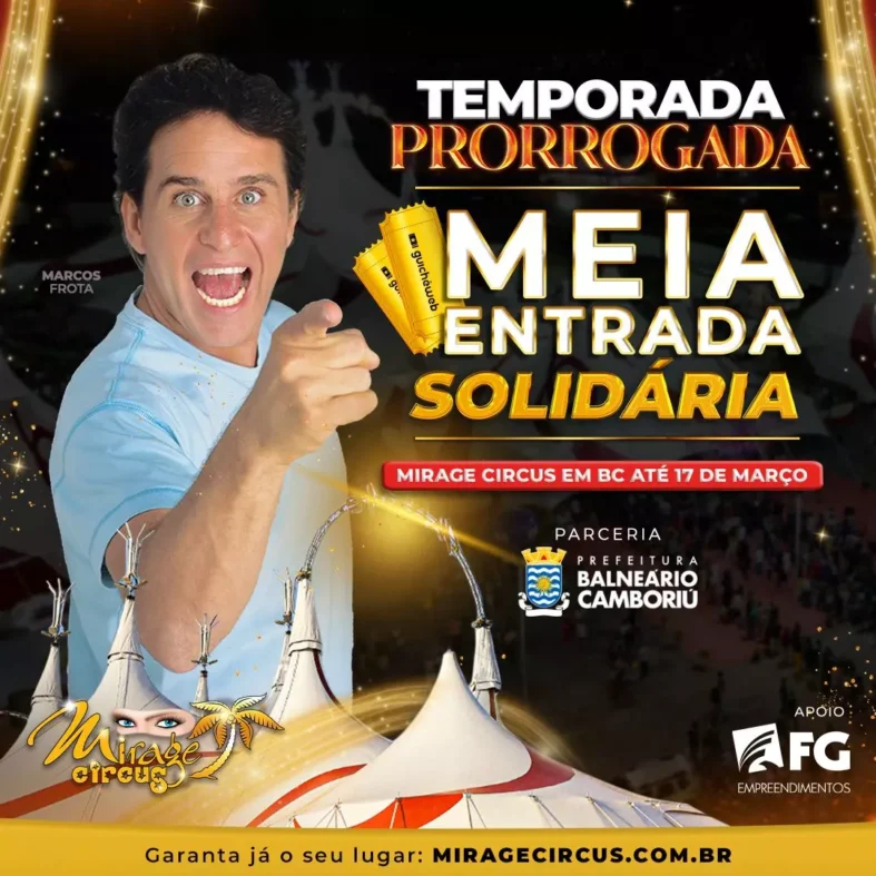 Em parceria com a prefeitura de Balneário Camboriú, o Mirage Circus, terá ingressos solidários a partir desta terça-feira, dia 05 de março. Na doação de um alimento não perecível, exceto sal e fubá, o visitante paga meia entrada em todos os setores. Para a compra de camarotes, para ter direito ao desconto, a doação é de cinco quilos de alimentos.