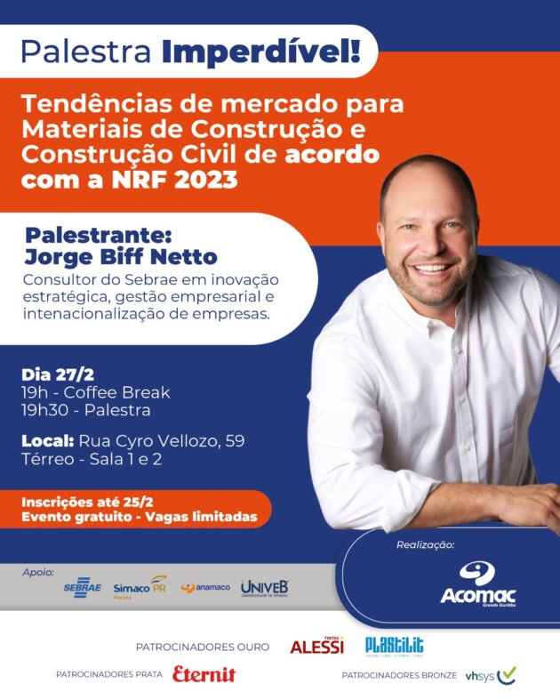 Na próxima segunda-feira (27), o Sebrae/PR e a Associação de Comerciantes de Material de Construção de Curitiba (Acomac) realizam o lançamento das ações previstas na parceria entre as duas instituições para 2023. O evento contará com uma palestra do especialista Jorge Biff Neto sobre tendências de mercado para a indústria e o comércio da construção civil. O conteúdo de tendências virá com base na NRF 2023 – Retail´s Big Show, a maior feira de varejo do mundo, realizada no mês de janeiro, em Nova York, nos Estados Unidos.