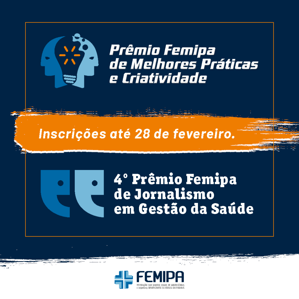 Os interessados em concorrer aos Prêmios da Femipa de Melhores Práticas e Criatividade e de Jornalismo em Gestão da Saúde têm até o dia 28 de fevereiro para garantir a inscrição. O primeiro visa reconhecer as ações de sucesso desenvolvidas nos hospitais paranaenses para melhoria da qualidade da gestão e da assistência à população do estado. Já a premiação de Jornalismo tem o objetivo de estimular a cobertura jornalística de qualidade relacionada à gestão da saúde no Paraná e reconhecer a excelência do trabalho da imprensa.